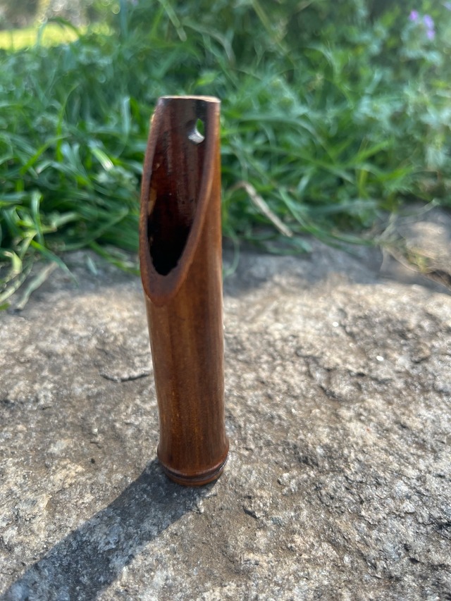 和竿職人大石稔のオリジナル作品 和竿を作る時に余った部分を活用し、 漆を丁寧に何度も塗って作成した花器です。 直径約2cmx高さ約10cm 大石さんは、和竿を作る仕事をしています。 旧浜川町の釣道具のお店に生まれ、 昭和46年頃より父親から習い始めました。 最近はカーボン製の釣竿が主流ですが、 大石さんが作っている和竿は竹製の竿です。 九州や千葉から取り寄せた竹を、竿の元、中、先などに 相応しい「しなり」や「堅さ」を見極めるところから 始まり、火で焼き(火入れ)、曲がりを直し、 次に、つなぎの加工、漆塗りなどいくつもの工程を経て、 約3ヶ月で完成させます。 現在では後進の育成を兼ねて、 竿作り教室を開催しています。